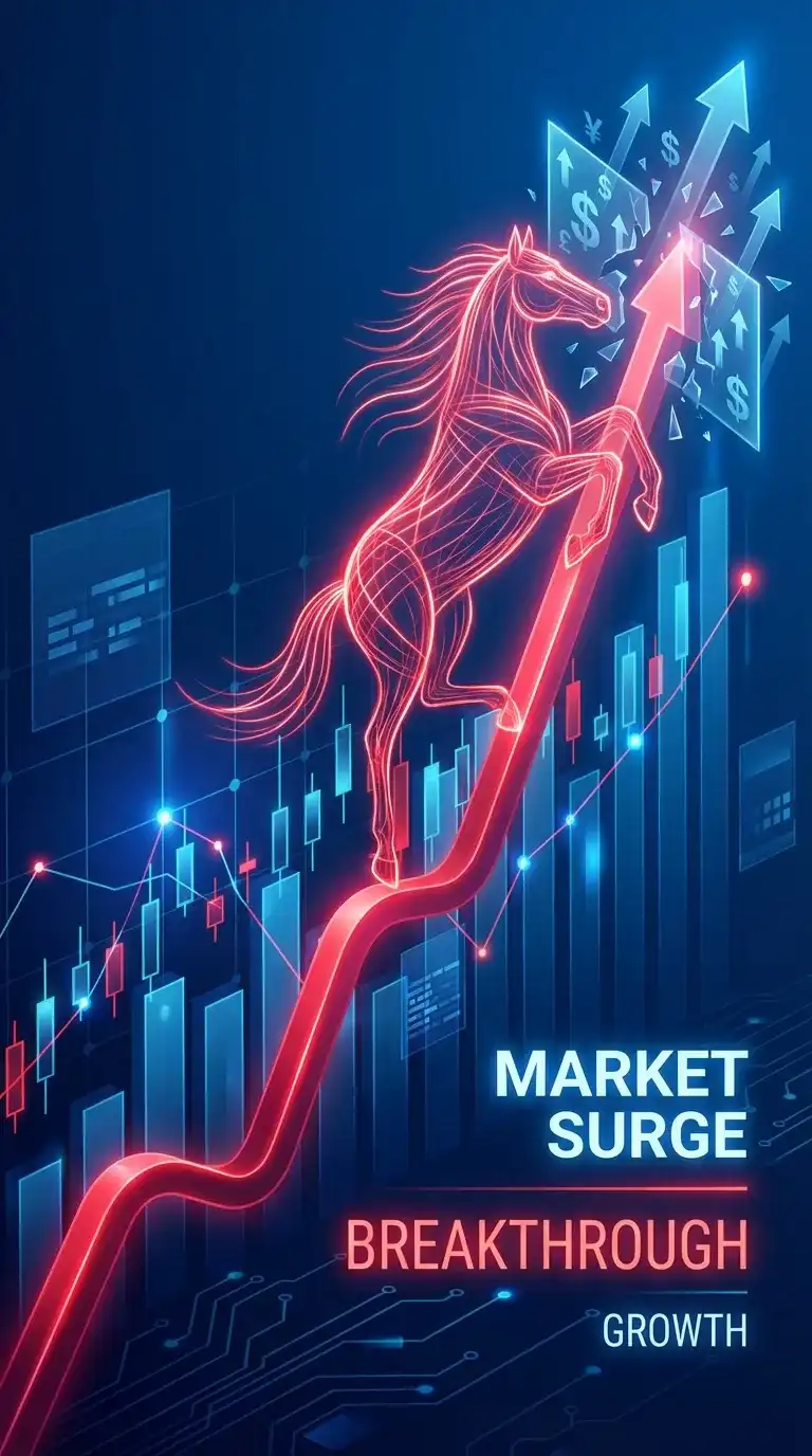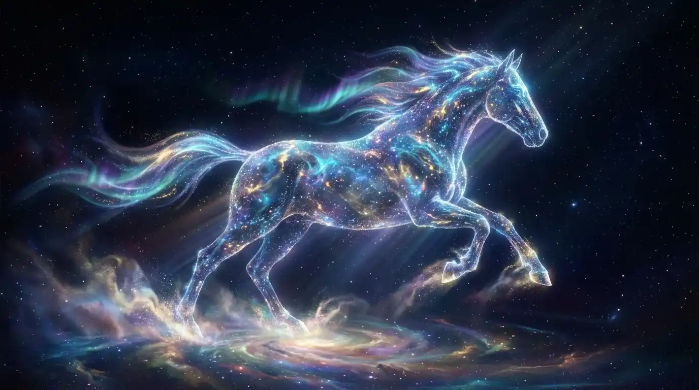 The painting employs a grand and dreamlike cosmic art style, with the main subject being a galloping horse composed of dazzling starlight and vibrant cosmic energy, aurora borealis mane…