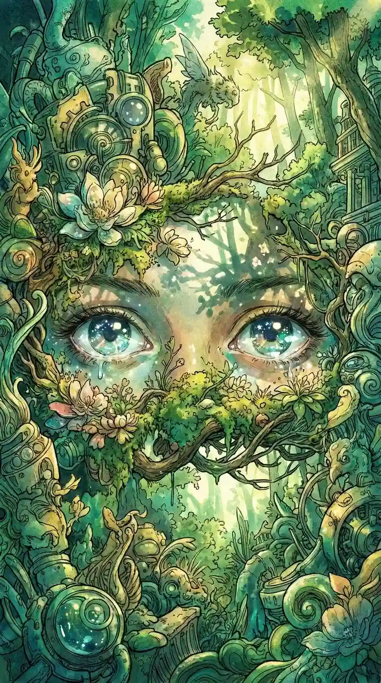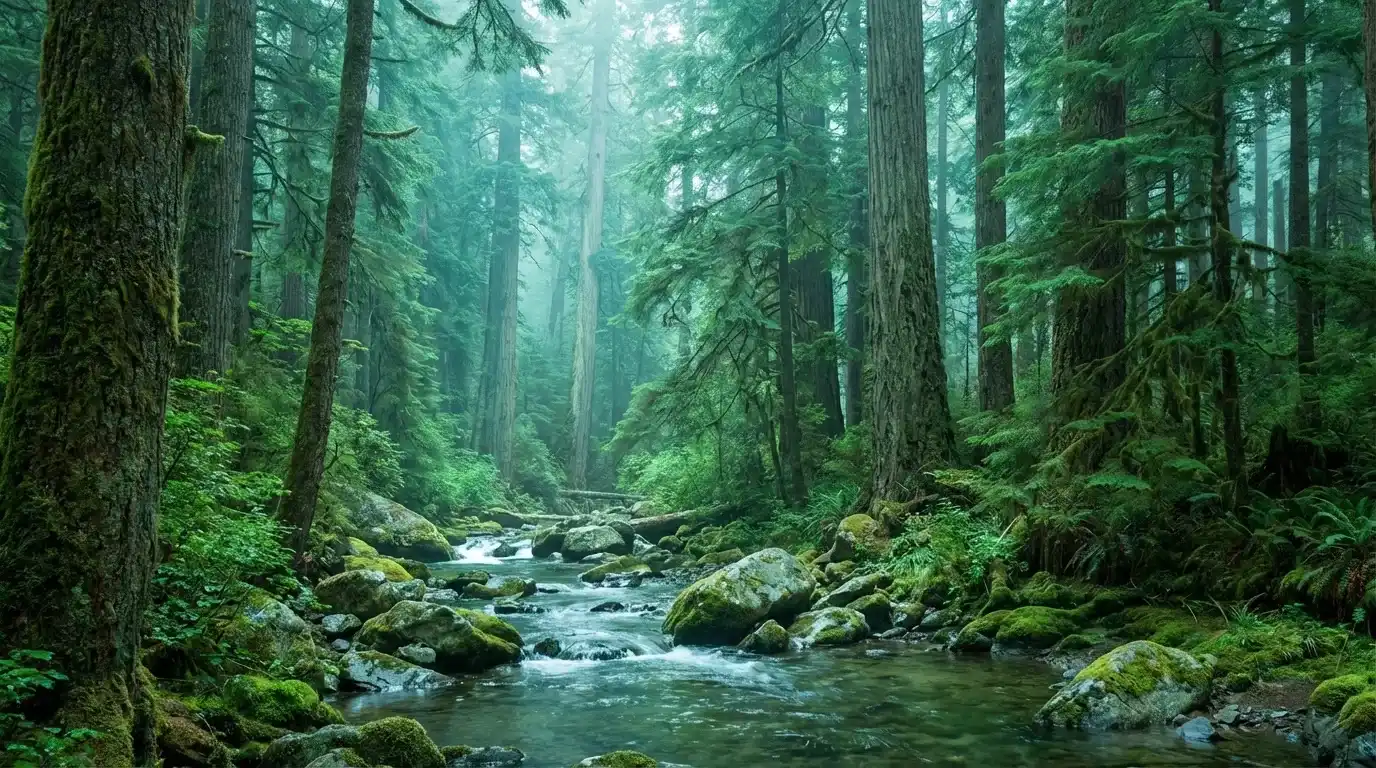A lush Western forest landscape in cool teal-green tones, panoramic wide view, dense evergreen trees, misty air, clear streams and mossy rocks, soft diffused daylight, calm and refreshing atmosphere…