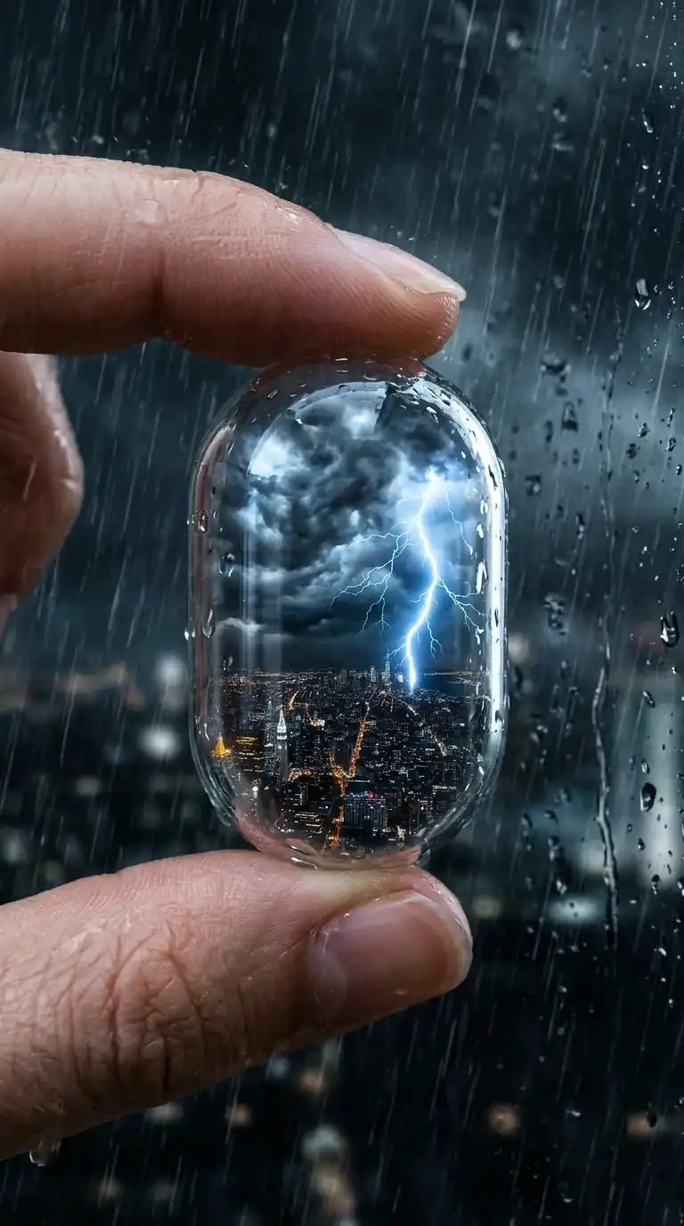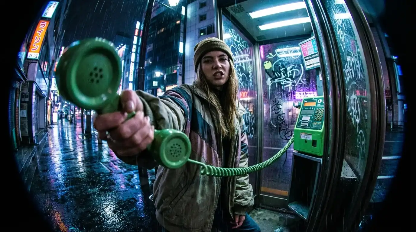 A dramatic street-style portrait shot with exaggerated fisheye lens distortion, a confident girl aggressively reaching toward the camera with a green phone receiver, rainy Tokyo night setting, cinematic lighting…